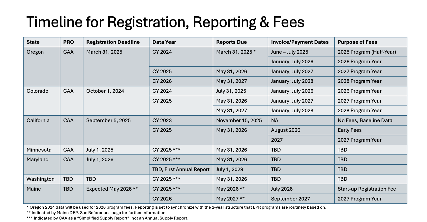 Click on the link for each state to view key timelines, updates, FAQs and more. Then download a document with an at-a-glance timeline of key events and regulatory deadlines for Extended Producer Responsibility (EPR) programs in seven states — California, Colorado, Maine, Maryland, Minnesota, Oregon, and Washington.